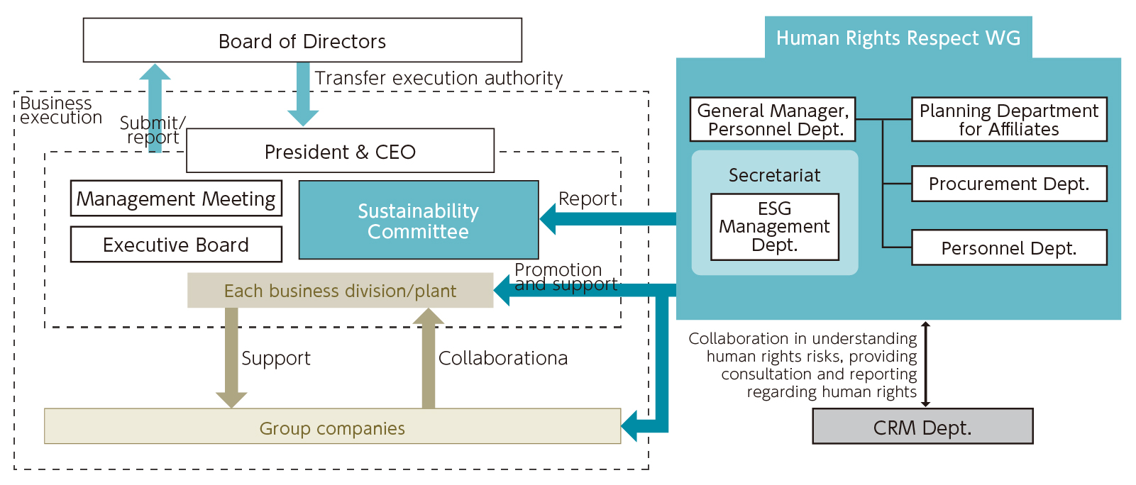 Under the supervision of the Board of Directors, we have established a Human Rights Respect Working Group (WG) under the Sustainability Committee, chaired by the President and CEO. The WG regularly reports on the status of human rights initiatives to this Committee. The Human Rights Respect WG plans and implements human rights due diligence not only within the company but also across group companies, identifies adverse impacts, and undertakes efforts to avoid, prevent, and mitigate such impacts. It also conducts awareness-raising activities for group companies and the supply chain.