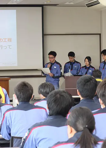 学園生は班ごとに分かれて学園生活を送ります。1日のスタートは朝礼から。その際、班ごとに交代で号令をかけて行動しますが、こうした声かけが現場に出た時の安全確認に役立つのです。また、交代制でモーニングスピーチも披露。人前で話すことで、意見をうまく伝える力が養われます。クレーンなどの資格の取得については、技能と合わせて危険予知も習得。高度な安全意識と確かな操作術を身につけた運転士へと育てます。スポーツや文化活動も活発です。サッカーや野球などは、ほかの企業の技術学園との対抗戦に出場。 絵画、写真、書道は、作品を発表できる場がきちんと設けられます。